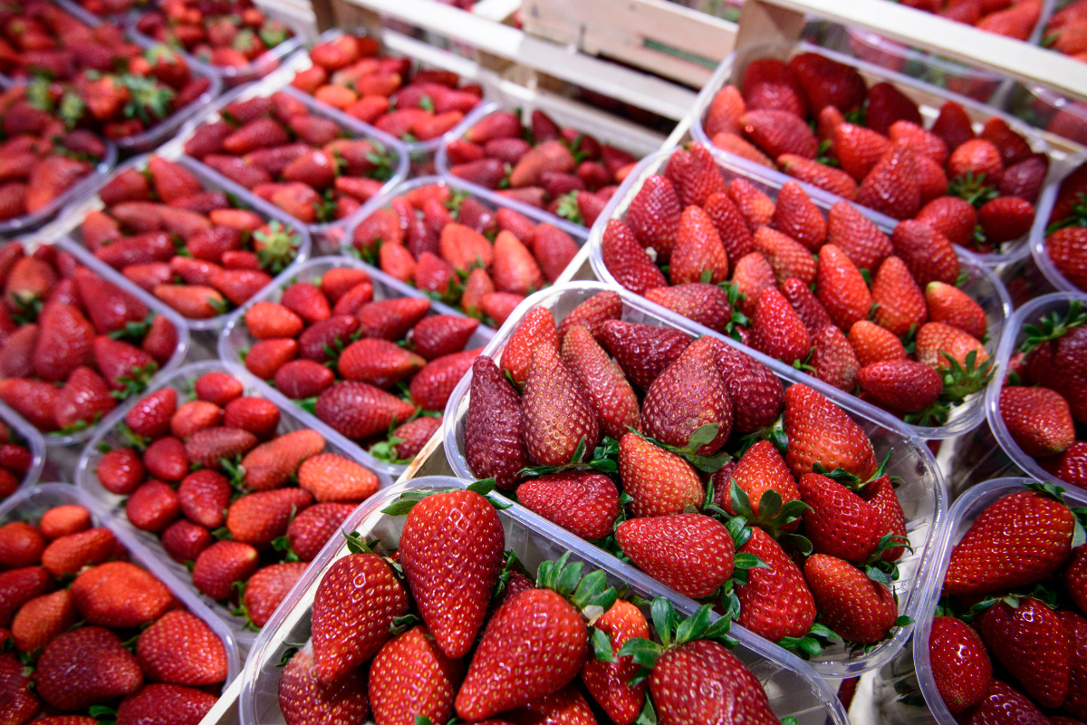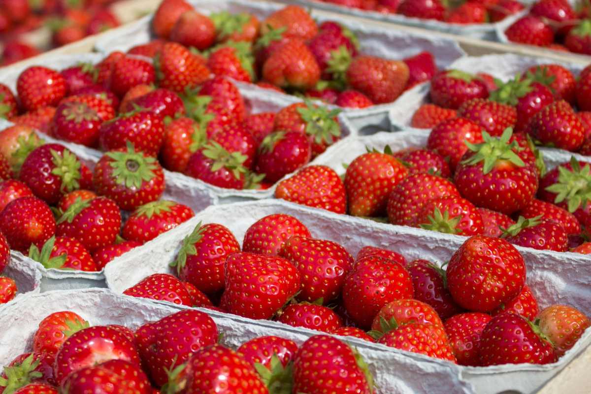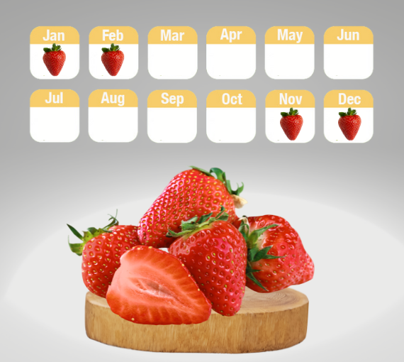 Strawberries have a high water content, about 90 per cent, and are relatively low in carbohydrates or sugars (6-9 per cent, averaging 10-14 per fruit). They are low in protein and fat, providing an average of 35 kcal or 146 kJ per 100 g, which is relatively low for a fruit. Their sweet taste is due to the carbohydrates. They are rich in vitamin C, with only 150 g of strawberries covering the recommended daily intake of 80 mg for adults. The mineral content of strawberries per 100 kcal is considerable, particularly magnesium (34 mg), calcium (57 mg) and iron (1.14 mg).